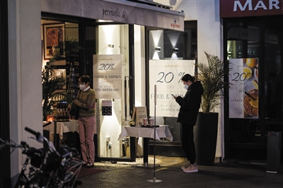 4月24日,两名女子在德国柏林一家餐馆外等待购买外带食品。