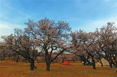 新荣区助马堡村民自发组织的杏花节开幕以来,吸引了不少游客,大家在这里赏花踏青、探古寻幽,享受惬意慢生活。 图为25日,游客在助马堡村杏树林赏花、宿营。