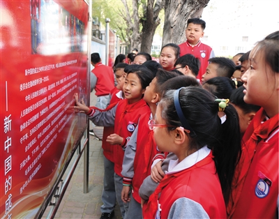 图为,学生们观看展板。 本报记者 戎禹仁 摄