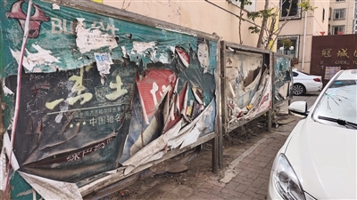 记者在该小区外看到,靠东侧立着3块广告牌,广告布十分破烂,与周边环境格格不入。