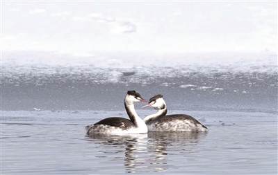 远远相望、极速踏水、挥翅相拥,炸开的脖羽犹如凤冠,摇头晃脑地跳着舞蹈,就像是久别重逢的情人一般诉说情话,传递着属于它们自己的语言。