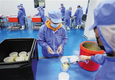 4月28日,唐山市路北区中央大厨房的工人在配餐车间工作。