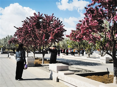 暮春时节的古都大同,蓝天白云交相辉映,全城绿化处处皆景。走进西城墙和北城墙带状公园,万株海棠竞相绽放,繁密的花朵与绿柳、草地、水面,构成一道亮丽的风景,展现在市民面前。