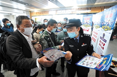 ◀ 4月29日,在南京站候车室,民警向旅客发放防范电信诈骗宣传材料。