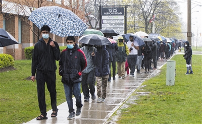 4月28日,在加拿大多伦多一个临时新冠疫苗接种点外,人们排队等待接种。
