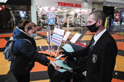 4月28日,在俄罗斯首都莫斯科,一名女子进入商场时接受体温检测。