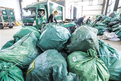 中国邮政集团河北省遵化市分公司的工作人员在整理快递包裹(5月3日摄)。