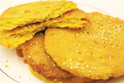 黄烧饼香甜酥脆,吃的时候要用一只手将饼竖起来,拿到嘴边,轻轻一咬,另一只手放在嘴下接着纷纷落下的碎屑。饼到嘴里,轻轻咀嚼,饼就化在嘴里,胡麻油和芝麻混合的香味充满口腔。即使整个饼吃完,嘴里仍留有余香。