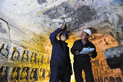 图为80后工作人员孙波(左)对石窟进行维护保养。 新华社发