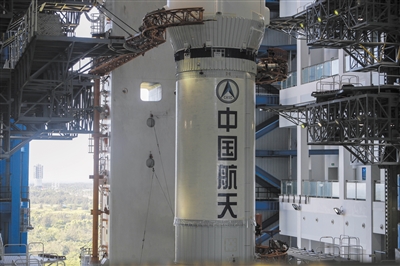 5月16日,天舟二号货运飞船与长征七号遥三运载火箭组合体等待转运至发射区。