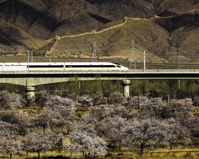 摄影作品《空中看大同长城古堡》将长城的磅礴气势和周边环境完美融合。作品中长城蜿蜒起伏,状若游龙,长城附近杏花遍野,十分壮观,长城脚下的高铁呼啸而过,与长城交相辉映成趣。