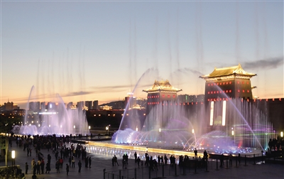 16日晚,记者在现场看到,随着《幸福大同》歌曲的响起,永泰门广场上的喷泉同时启动,配合着悠扬婉转的曲调,音乐喷泉中的水柱摆动着婀娜的身姿,与喷泉池中密布的水花和灯光组成了色彩斑斓的水幕,场景蔚为壮观。图为,五彩斑斓的喷泉吸引了大批市民前往观看。