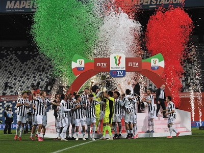 19日,在2020-2021赛季意大利杯足球赛决赛中,尤文图斯队以2∶1战胜亚特兰大队,夺得冠军。图为尤文图斯队球员在颁奖仪式上捧杯庆祝。