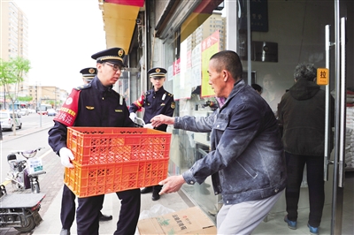 图为26日,平城区市容监察管理处新华街街道监察大队执法人员为辖区商户讲解《门前五包责任制》承诺书,并将沿街商户占道物品搬回店内。