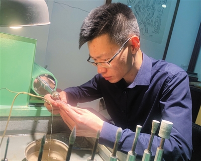 记者了解到,崔英男已有8年的玉石雕刻经验。从学画画开始,就很喜欢研究北魏文化,常常去云冈石窟写生,西安工程大学毕业后赴苏州,师承中国工艺美术大师、玉雕大师范同生,在“文同轩”苏州玉雕艺术馆学习期间,也常常会创作一些与云冈石窟相关的作品。2019年他从苏州回到大同后,在鼓楼古玩城一楼成立了“崔英男玉雕工作室”,策划并雕刻了一系列有关云冈石窟题材的玉雕作品,他希望通过他的玉雕作品,让更多的人认识云冈石窟、了解北魏文化。
