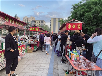 “小伙儿进来坐,尝尝我们家美味的水煮串。”“吃好了下次再来啊。”一家水煮串摊点前坐满了食客,老板一边忙着招呼客人,一边熟练地清理着桌上的餐盘。“我们每天16时出摊,18时左右就陆续有吃客了。这几天还不是人气最旺的时候,有许多商家还没有出摊,等过段时间,又会是另一番红火景象了!”老板笑着说。在另一家小吃摊前,摊主正熟练地翻炒着铁板上的食材,不一会儿,一碗色香味俱全的烤冷面就递到了食客手中。“平时习惯了在单位吃工作餐,偶尔出来吃吃这些街边夜市小吃,生活才显得有烟火气嘛!”一位小伙儿打趣说。