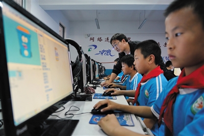 ▲5月31日,河北省滦州市第四实验小学老师在下午放学后指导学生练习计算机编程。