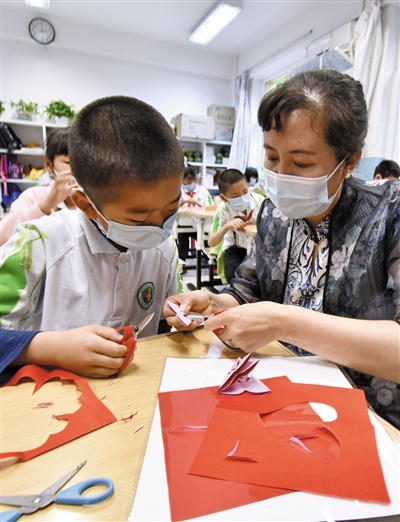 ▶5月31日,非遗传承人刘晓迪(右)带领孩子学习剪纸。