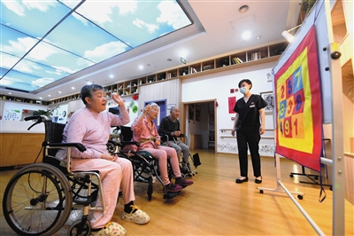 6月2日,在石家庄桥西区振头街道普爱养老照护中心,照护人员与老人做游戏。