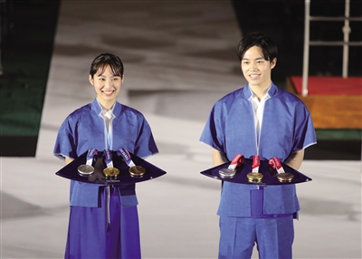 3日是东京奥运会开幕倒计时50天纪念日,东京奥组委在东京有明体育馆举行仪式,发布用于奥运会和残奥会颁奖使用的音乐、领奖台、颁奖志愿者礼服以及颁奖时盛放奖牌的托盘等物品。图为工作人员在发布仪式上展示颁奖志愿者礼服和奖牌托盘。