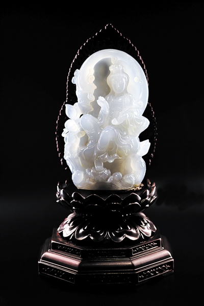 童子拜观音,大同玉质地,净重1.688公斤,净高18.8厘米,厚16厘米,宽12.8厘米。浑身上下通透明亮,中部现蓝色光泽。整体布局合理,依型造意,主体架构完美展现观音造像,左下角辅以一童子,底座配祥云环绕,既层次鲜明,又生趣盎然,整件作品浑然一体,让人过目难忘。