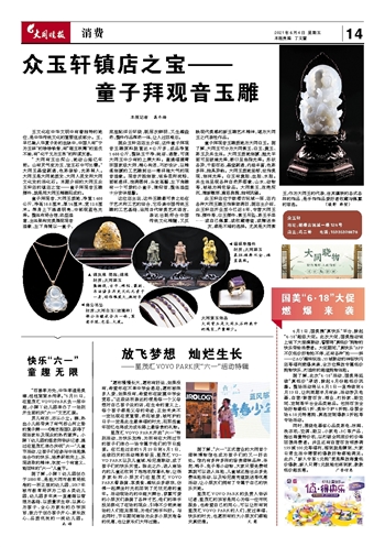 众玉轩店位于鼓楼古玩城一层,店内各种大同玉雕玉饰琳琅满目,据店主介绍,众玉轩店开业至今已近8年,专营大同玉饰、摆件等,白玉摆件、紫玉吊坠、彩玉手串……或自己佩戴,或收藏增值,或赠送亲友,都是不错的选择。尤其是大同紫玉,作为大同玉的代表,由其镶嵌的各式各样的饰品,是手饰饰品爱好者收藏与佩戴的首选。 (摄影 韩堃)