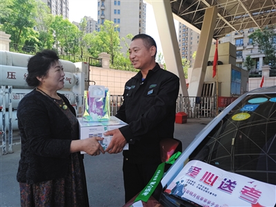 曹美英是我市一家石化公司的负责人,平日里出租车司机经常到她的站点加油、加气。2014年高考前,市金鼎出租汽车公司爱心车队队长张清德来到她的站点加气时,曹美英得知我市许多出租车司机为了给广大考生提供出行方便,在高考期间参加大同日报“爱心送考”活动,免费接送考生。“因平日里接触的出租车司机多,也深知他们干这一行的不易,所以他们的举动让我很是感动,从当年开始,我就为这些出租车司机赠送饮用水,此外,还有洗车卡、鸡蛋等。”