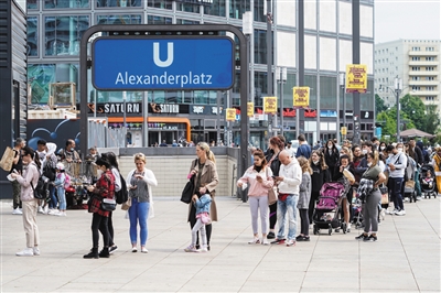 6月4日,人们在德国柏林亚历山大广场排队等待进入一家商店。