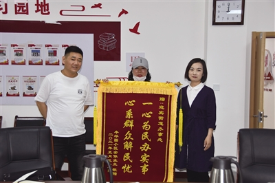 本报讯 (记者 段雨萌) 近日,平城区丰华园小区居民代表李女士将一面写有“一心为民办实事,心系群众解民忧”的锦旗送到了迎宾街道办事处,李女士激动说:“太感谢街道办事处了,为我们解决了大问题。”