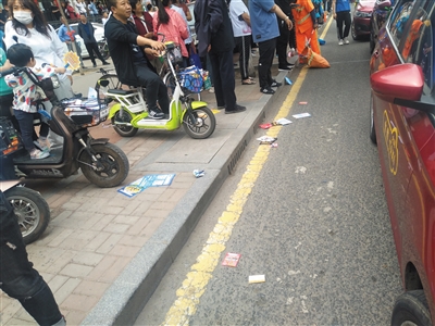 随后,记者来到大同一中考点附近看到,在家长等候区内随处可见宣传单、空饮料瓶、酸奶盒扔在道路上,甚至还有烟头儿。家长的不文明行为可苦了负责这一区域的环卫工,他们只能不间断地清理。