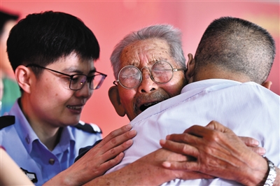 在山东主会场,3位被拐失踪人员与失散长达数十年的亲人相拥而泣,其中,来自山东枣庄的90岁老人罗某坤和儿子罗某军失散长达58年。在三个分会场,有的失踪被拐人员与家人分离时仅1岁,有的失踪被拐人员凭借零星记忆多年来坚持寻亲……各会场认亲家庭向公安机关献上锦旗,感谢办案民警的坚守和付出。