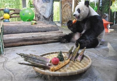 6月14日,在位于海口的海南热带野生动植物园,大熊猫“贡贡”享用美食。
