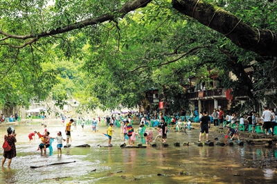 6月14日,游客在重庆市北碚区偏岩古镇纳凉戏水。