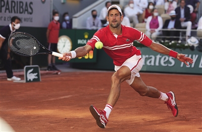 6月13日,在巴黎进行的2021法国网球公开赛男子单打决赛中,塞尔维亚选手焦科维奇以3∶2战胜希腊选手齐齐帕斯,夺得职业生涯第19个大满贯冠军。图为焦科维奇在比赛中回球。
