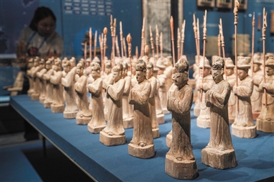 6月16日,参观者在扬州中国大运河博物馆内参观“鲁荒王墓木俑仪仗类明器”(仿制品)。