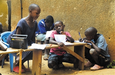 6月14日,小学生在乌干达首都坎帕拉利用收音机收听无线电广播的教学内容。