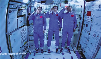 17日,航天员在天和核心舱内向全国人民敬礼致意。 新华社发