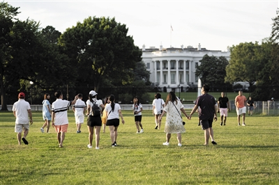 ◀ 6月22日,游客在美国首都华盛顿的白宫附近游览。