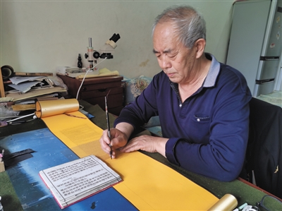 这位习书者名叫昝宝,今年69岁。24日下午,记者上门采访他时,他正在卷轴上书写微楷,只见他腰身挺直地端坐书桌旁,一手压纸一手书写,神态自若。在整个书写过程中,昝宝始终没戴眼镜,书写似乎也不费力。写出来的字米粒一般大小,字迹工整,笔墨细腻,如此微小的字竟然出自一位年近七旬的老者之手,的确令人佩服。