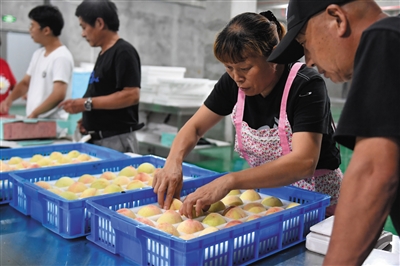近日,“中国水蜜桃之乡”浙江省宁波市奉化区水蜜桃陆续开摘上市。奉化水蜜桃栽培历史悠久,水蜜桃产业已形成了早、中、晚熟相配套的30个主要栽培品种体系,成为当地农民增收致富的支柱产业。 本版文图据新华社