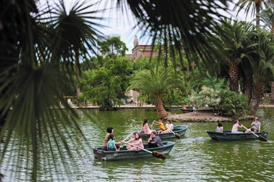 6月26日,人们在西班牙巴塞罗那的城堡公园划船。