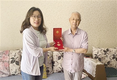 图为工作人员为老党员米春林颁发纪念章。 本报记者 段雨萌