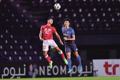 ▲ 6月30日,在泰国武里南进行的2021赛季亚洲足球冠军联赛小组赛中,广州队以0∶1不敌中国香港杰志队。图为广州队球员黄开洲(左)与中国香港杰志队球员朴俊炯在比赛中争顶。