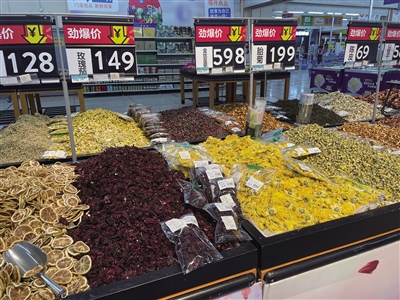 在永泰南路某大型超市内,货架上除了摆放着散装及打包好的玫瑰花、菊花、茉莉花等外,还有山楂干、陈皮、决明子等各式解暑消食食材,吸引了不少市民驻足选购。超市销售人员告诉记者,每年夏天是花茶的销售旺季,随着气温不断升高,买花茶喝的人越来越多,喝花茶渐渐成为一种时尚养生潮流。