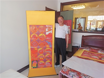 随着年龄的增长,张予竹越来越深爱剪纸艺术这门中国传统文化。近几年,他的作品中饱含了家国情怀。去年疫情期间,他创作了多幅衬色剪纸作品,作品致敬抗疫英雄,为武汉加油,为中国加油。从去年年底,他利用两个月的时间,完成了长2.1米、宽1米的《庆祝中国共产党成立一百周年》长幅衬色剪纸作品。近日,他又完成了高1.38米、宽68厘米《中国古都 天下大同》长幅衬色剪纸作品,作为庆祝中国共产党百年华诞的一份献礼。