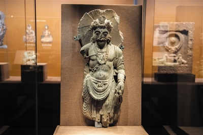 这是7月10日在湖南省博物馆拍摄的巴基斯坦出土的文物“灰片岩观音菩萨像”。