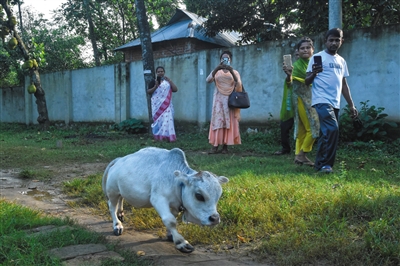 7月8日,在孟加拉国首都达卡附近萨瓦尔一处农场,人们围观奶牛“拉妮”。
