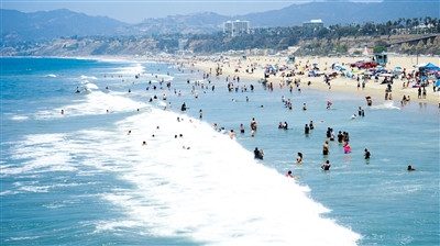 7月11日,人们在美国加利福尼亚州圣莫尼卡海滩消暑。