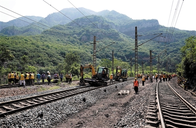目前,中国铁路郑州局集团有限公司组织抢险人员,进行边坡塌方地段加固铁路线路工作,利用挖掘机清理掩埋线路淤泥和石块,对损坏的轨道进行切割清除,重新铺设轨道;同时,拆除被毁的桥墩,重新架设桥梁。