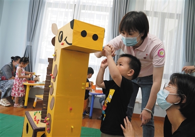 7月14日,在奉贤区奉浦街道秦塘生活驿站,早教老师在指导小朋友玩游戏。